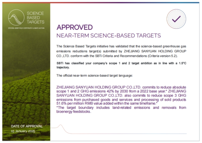 Sanyuan Group achieved certification of its greenhouse gas (GHG) emission reduction targets by the Science Based Targets (SBTi) initiative recently . This significant milestone marks a significant step forward for Sanyuan Group in addressing climate change and implementing its commitment to sustainable development. It also demonstrates the Group’s unwavering commitment to working with SBTi to limit global temperature rise to 1.5°C.